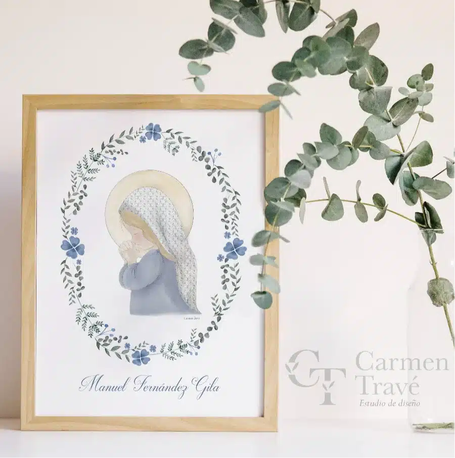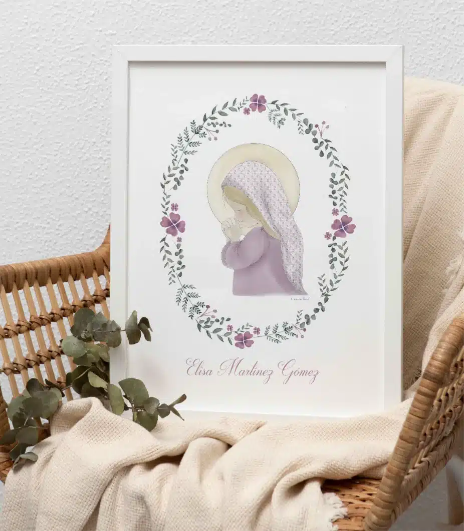 Los cuadros Virgencita con guirnalda son una preciosa idea de regalo para los más pequeños. Puedes personalizar el diseño, el color de pelo y añadir el texto que desees. El tamaño estándar es de 20×25 cm, aunque nos adaptamos a las dimensiones que prefieras. También puedes incluir un marco por un coste adicional de +8€. ¡Haz tu pedido y nos pondremos en contacto en 24/48 horas para definir todos los detalles!