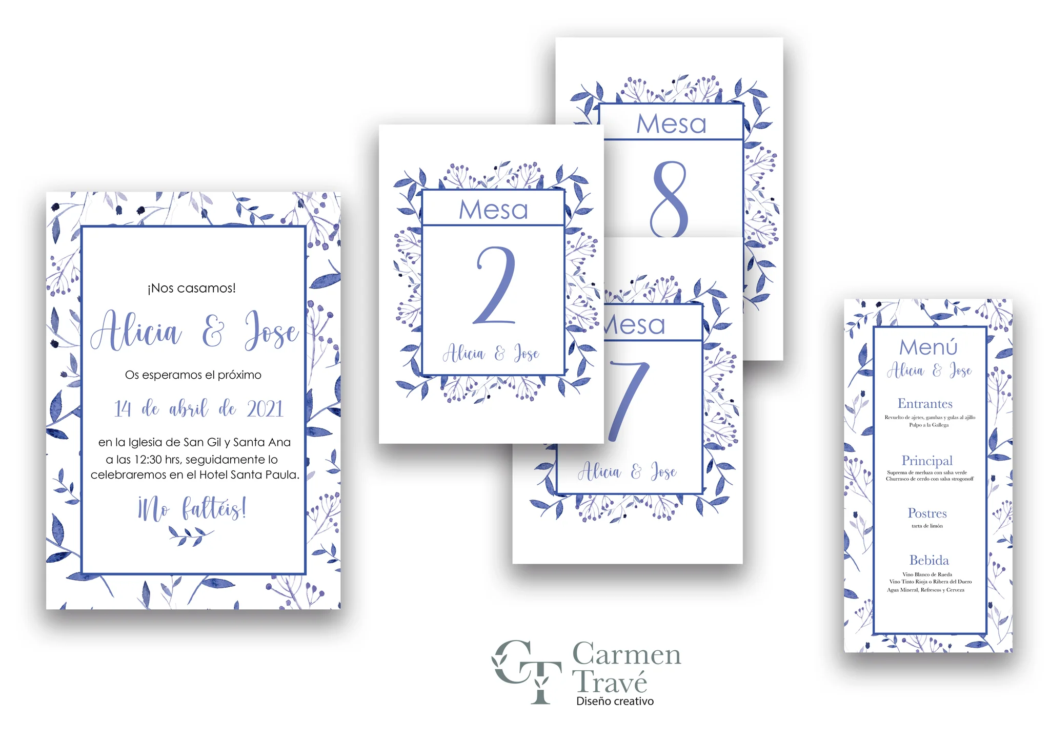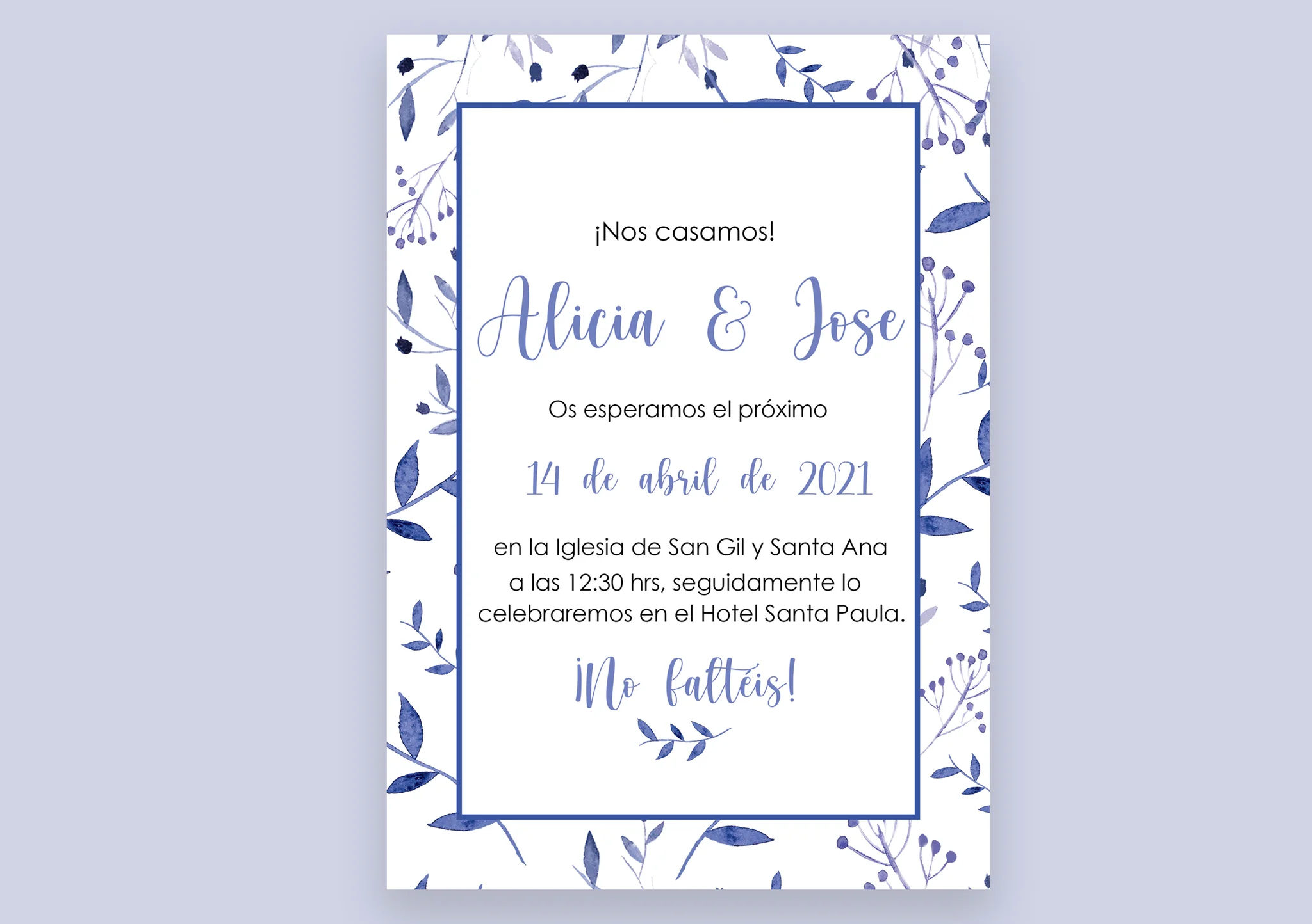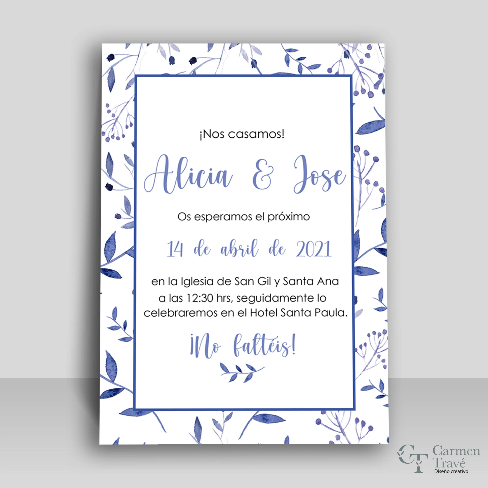La invitación de boda Alma representa frescura, armonía y ternura en una sola pieza. Con un delicado estampado de hojas y ramitas en acuarela azul, la invitación de boda Alma destaca por su elegancia ligera y su estilo romántico, ideal para bodas primaverales o celebraciones con inspiración mediterránea.