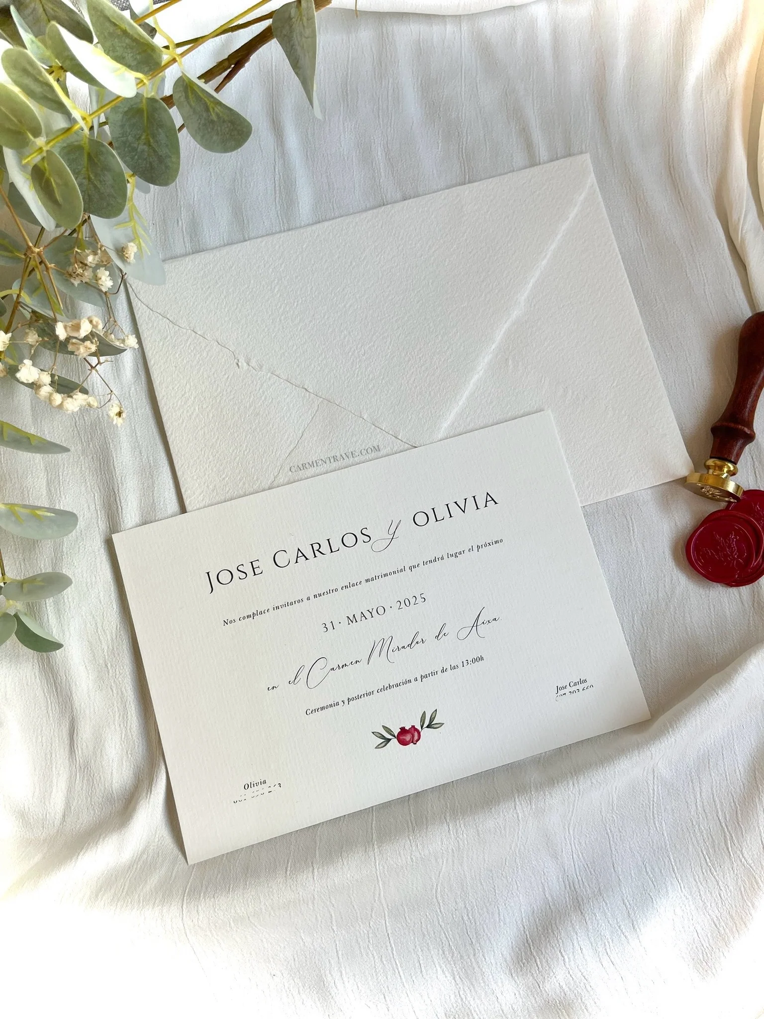 Nota: El sobre blanco roto y los complementos como sellos de lacre o decoración botánica se adquieren por separado. Para presupuestos personalizados o coordinados completos, visita nuestra sección de contacto.
