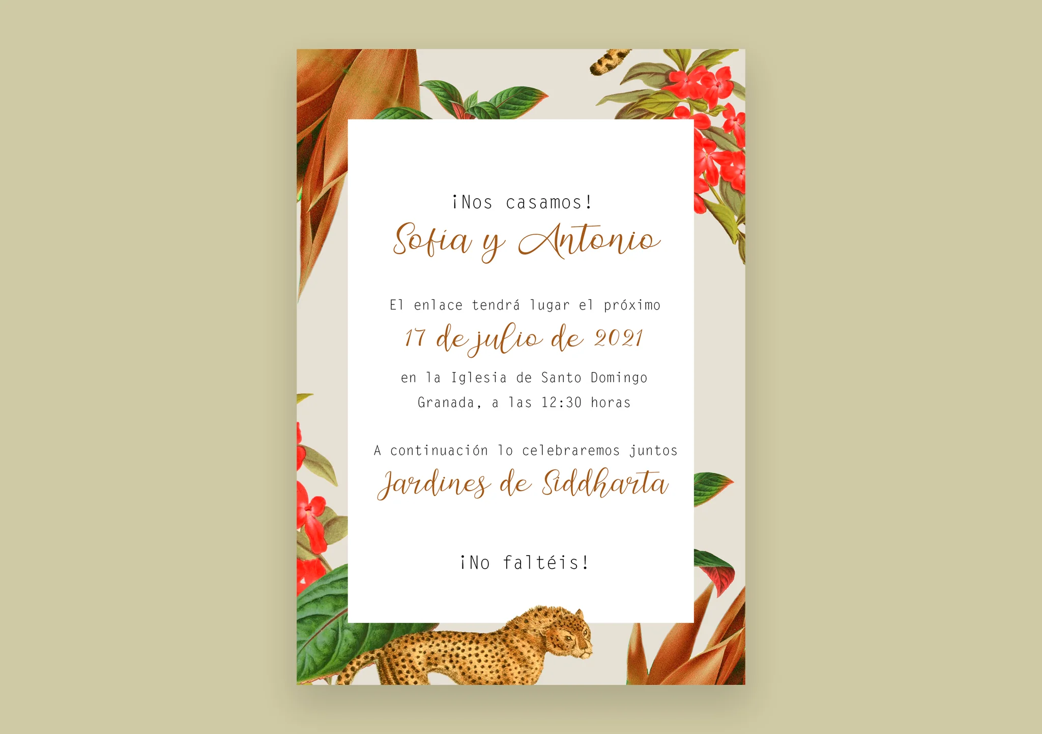 La invitación de boda Colección Salvaje es una explosión de color, alegría y energía. Con un diseño tropical que incluye hojas exuberantes, flores rojas vibrantes y un elegante guepardo ilustrado, la invitación de boda Colección Salvaje destaca por su estilo exótico, libre y lleno de personalidad.