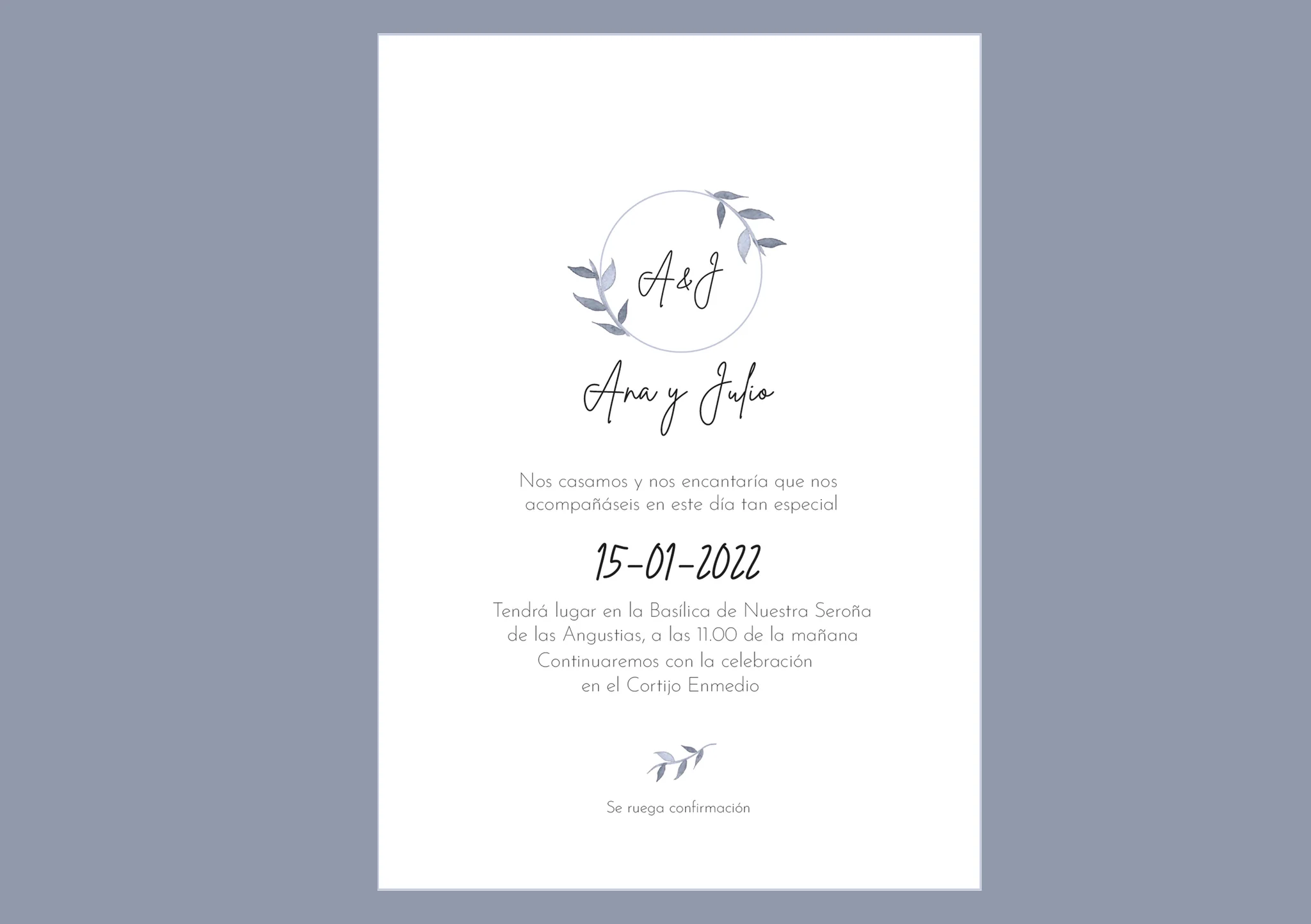 Invitación minimalista con detalles botánicos en azul. Elegante, limpia y perfecta para bodas íntimas o contemporáneas.