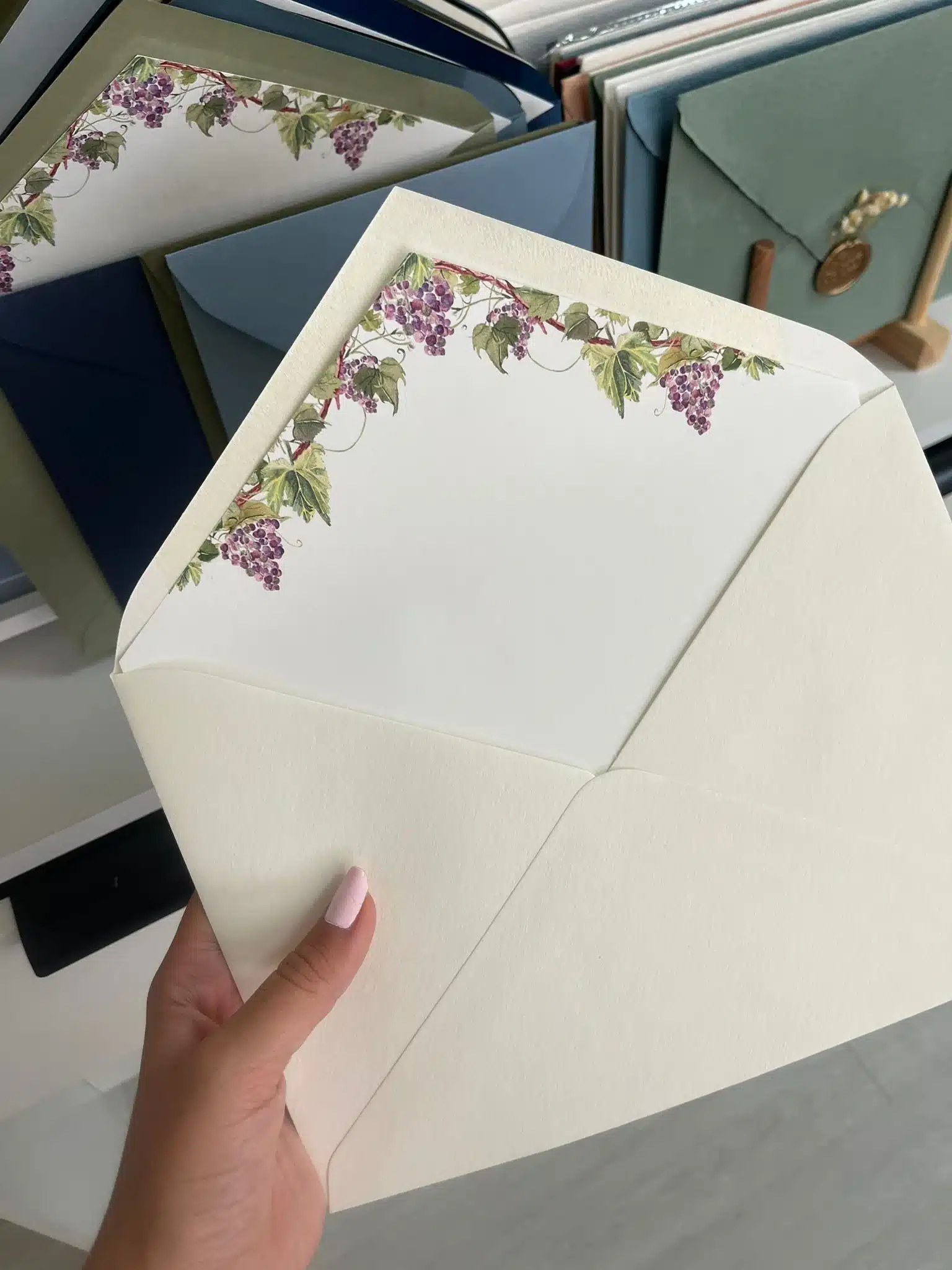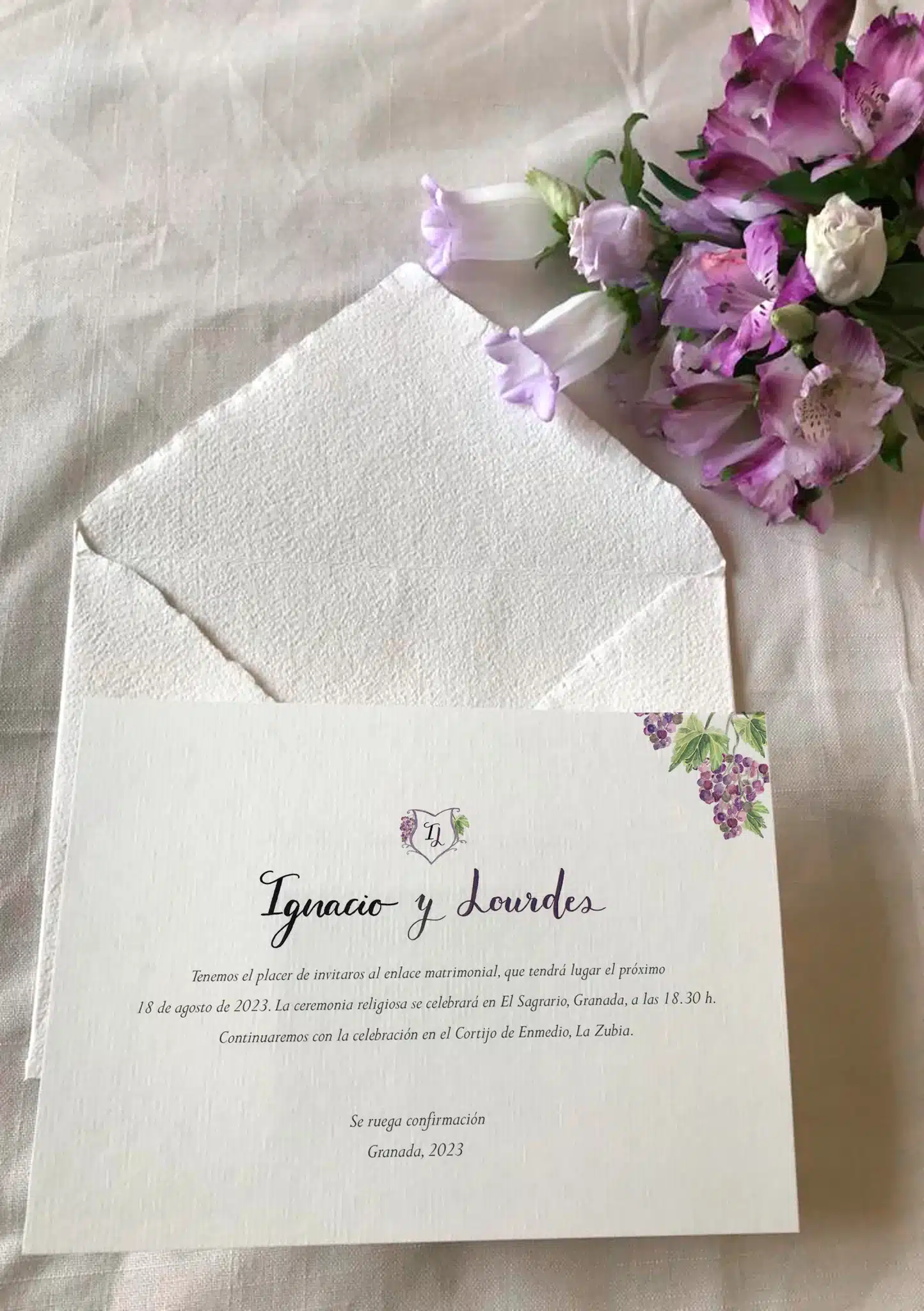 El papel texturizado y la combinación de tonos burdeos, verde y lavanda evocan el otoño y la vendimia, mientras la caligrafía fluida en color vino aporta un aire romántico y sofisticado. Esta invitación de boda rústica se completa con sobre burdeos con lacre y forro ilustrado, ofreciendo un acabado elegante y muy especial.