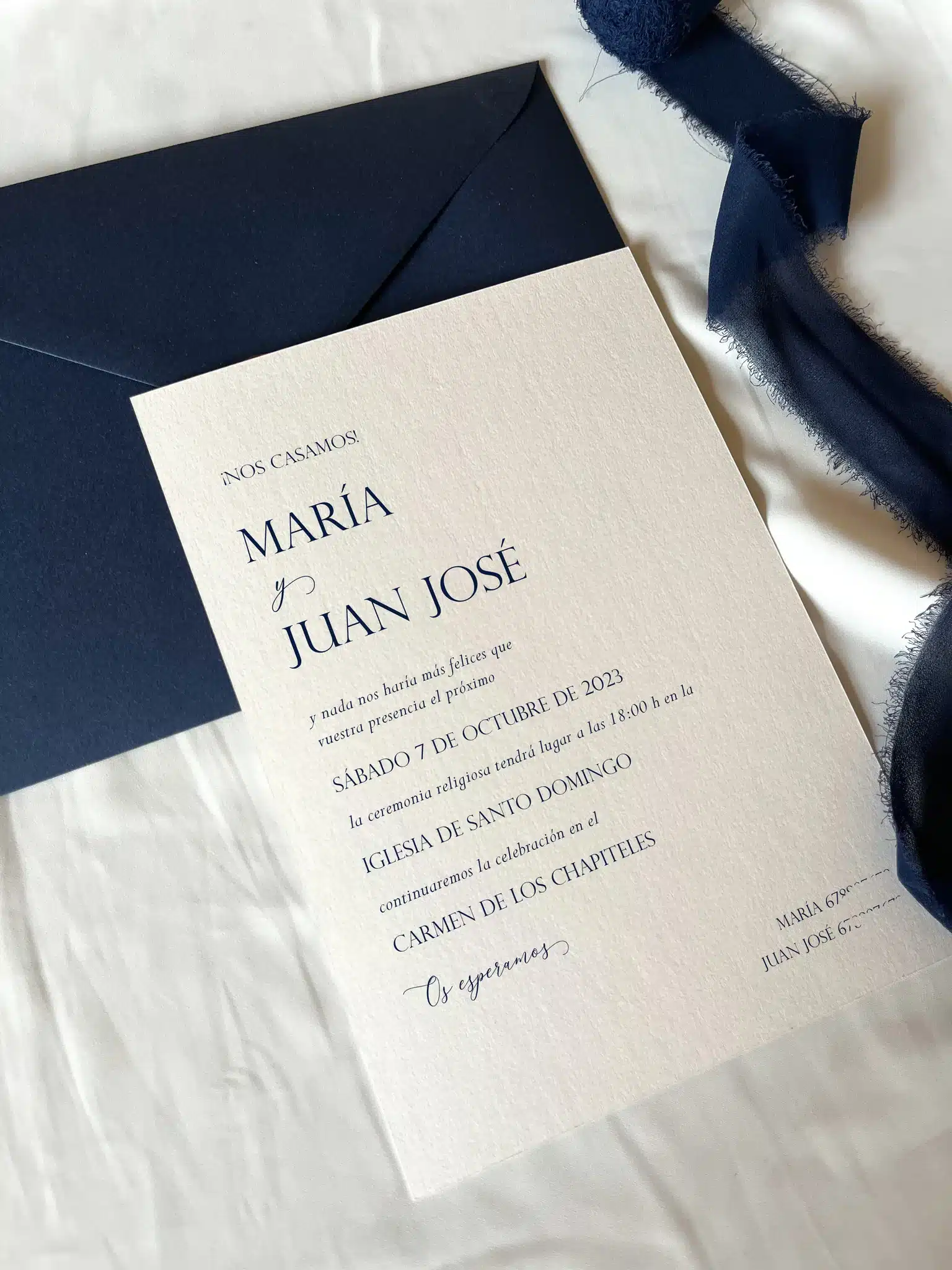 Invitación de boda elegante y minimalista con tipografía azul marino sobre papel verjurado. Perfecta para celebraciones clásicas, urbanas o sobrias.