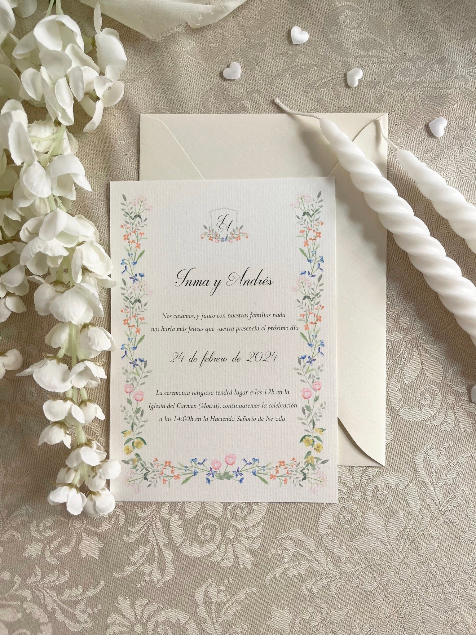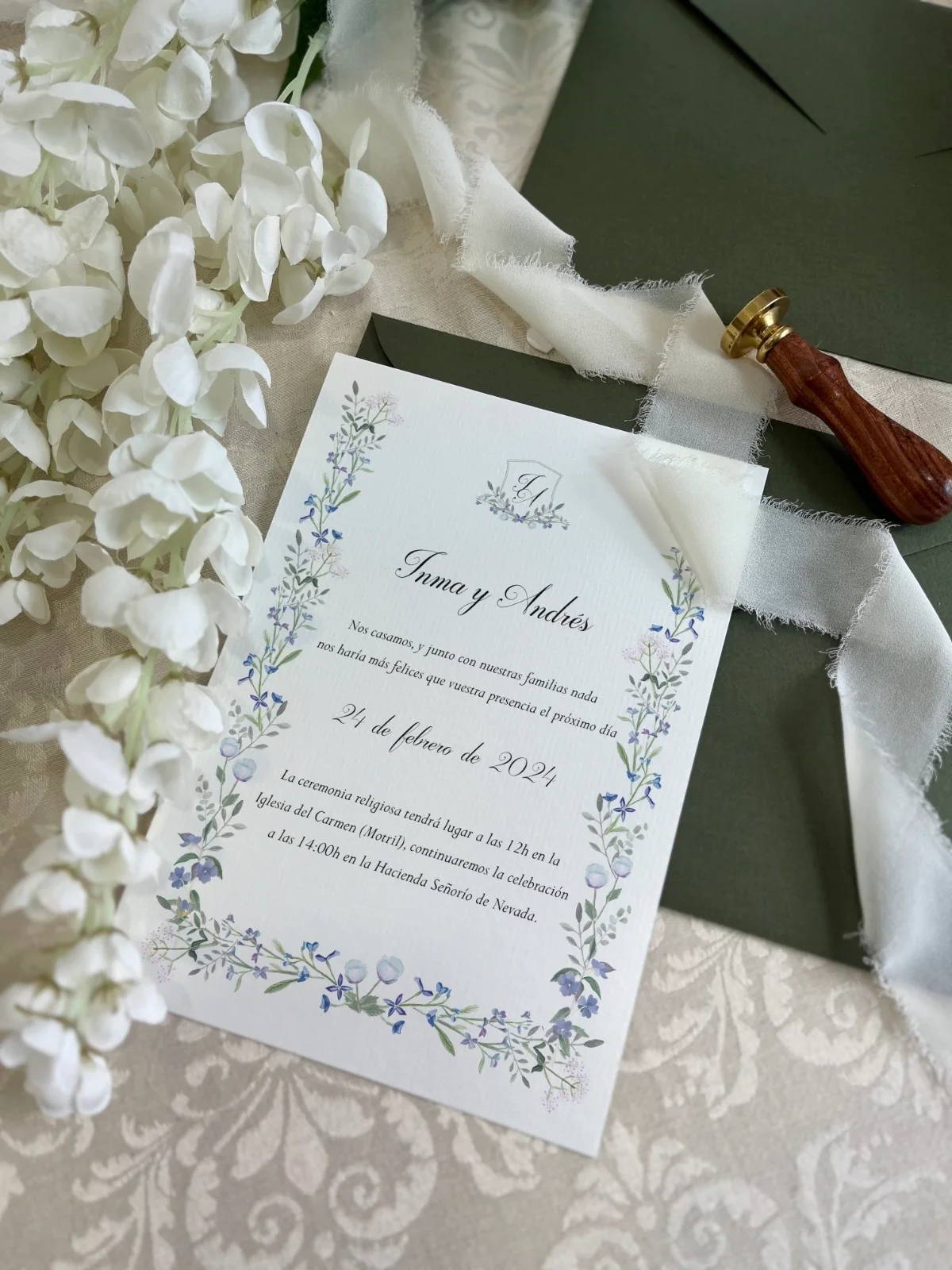 Elegante y personalizable, la invitación Generalife permite ajustar tipografía, colores y formatos para adaptarse a tu evento. El precio incluye solo la invitación; los sobres se venden por separado. Estamos aquí para asesorarte en la elección del sobre ideal.