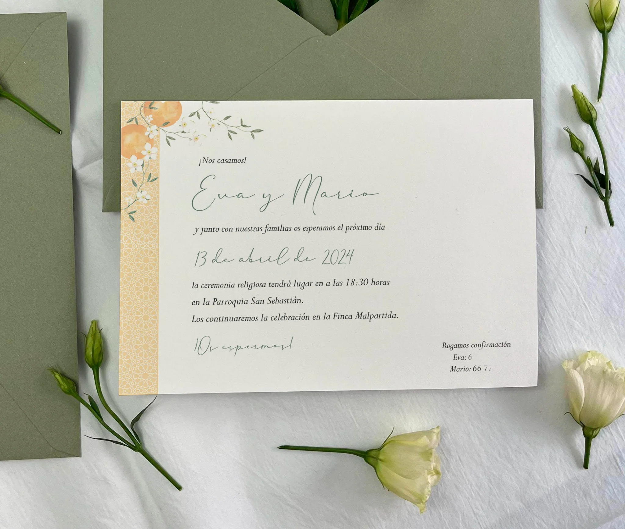 Elegante y personalizable, la invitación Nazarí permite ajustar tipografía, colores y formatos para adaptarse a tu evento. El precio incluye solo la invitación; los sobres se venden por separado. Estamos aquí para asesorarte en la elección del sobre ideal.