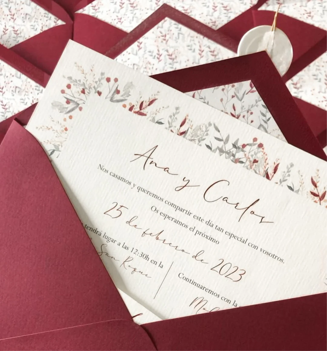 Haz de tu evento algo inolvidable con las invitaciones Silvestre Granate, personalizadas hasta el último detalle.