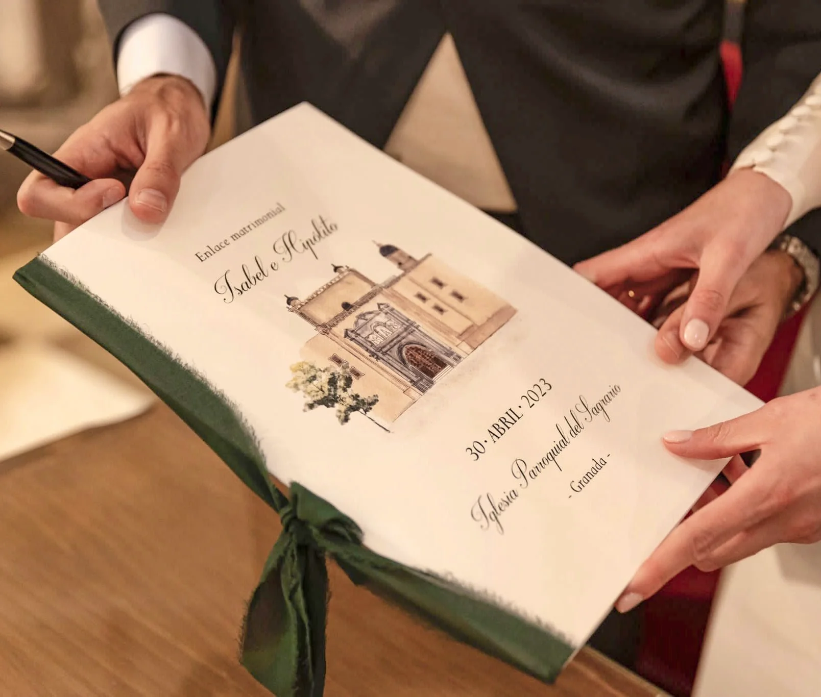 El libro de firmas está personalizado con los nombres de los novios, la fecha y el lugar de la ceremonia, creando una pieza que podrás atesorar por siempre. Perfecto para colocar en la ceremonia o en la recepción, este libro es ideal para que tanto los testigos como los invitados más cercanos dejen sus mejores deseos y palabras de aliento en un día tan especial.
