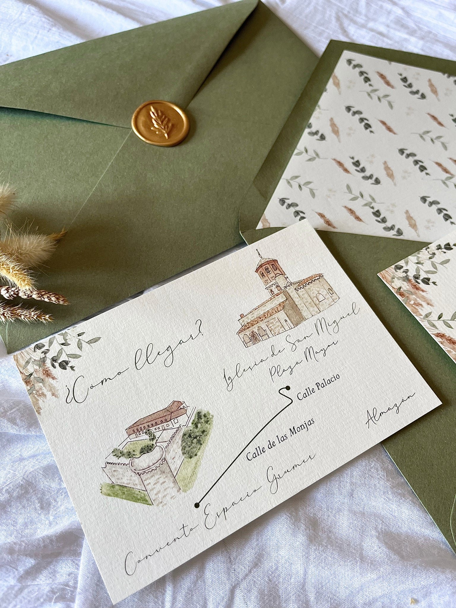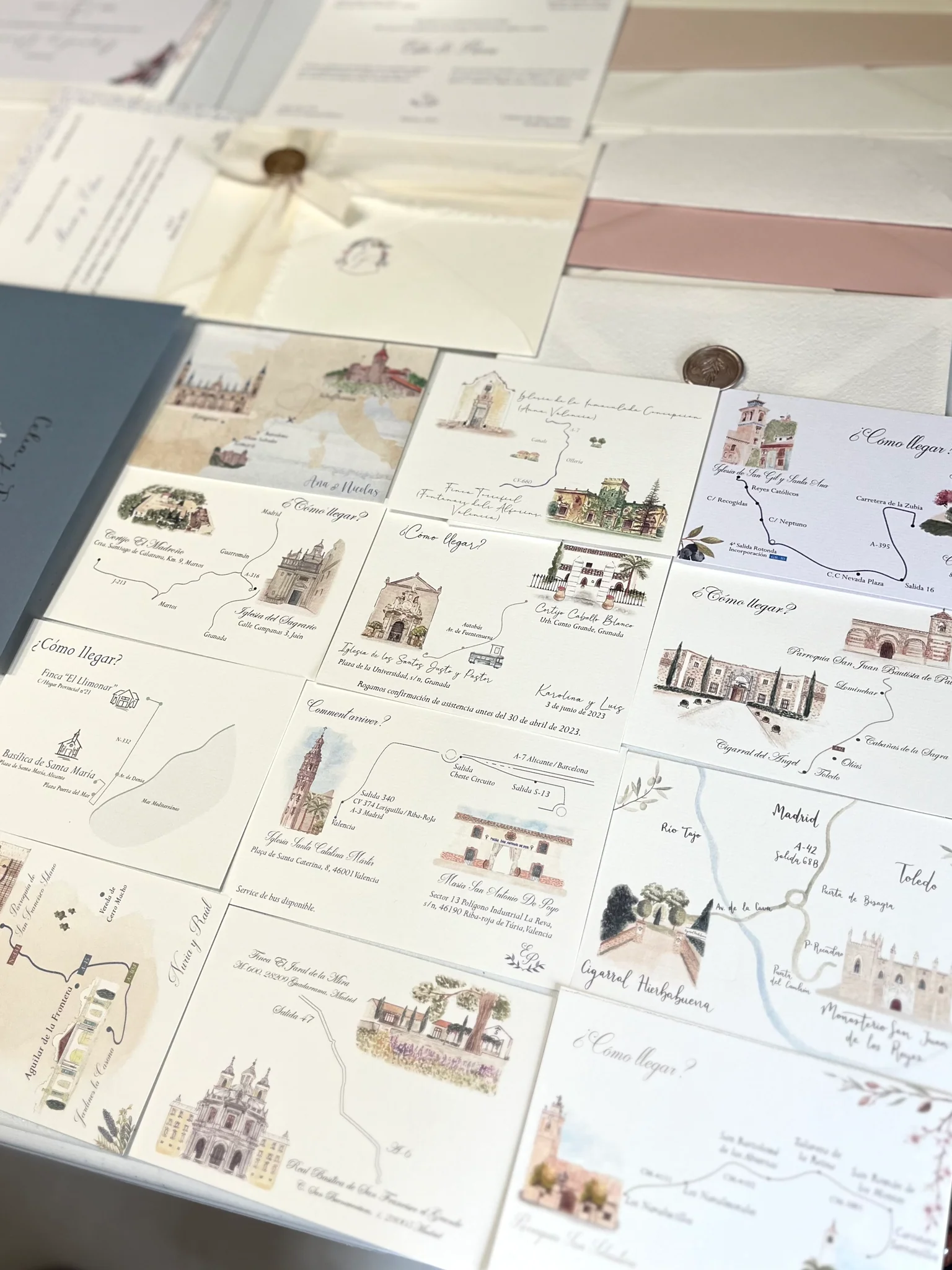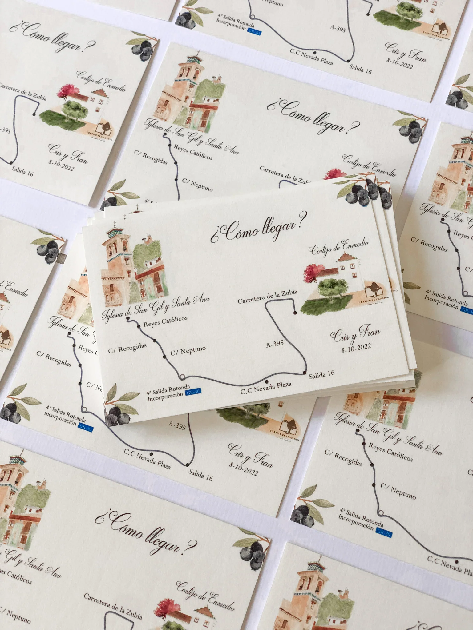 Añade un toque personal y artístico a tus invitaciones de boda con nuestros mapas ilustrados personalizados. Diseñados cuidadosamente para guiar a tus invitados, estos mapas incluyen indicaciones claras y precisas para llegar a los lugares clave de tu evento, como la iglesia y el lugar de celebración.
