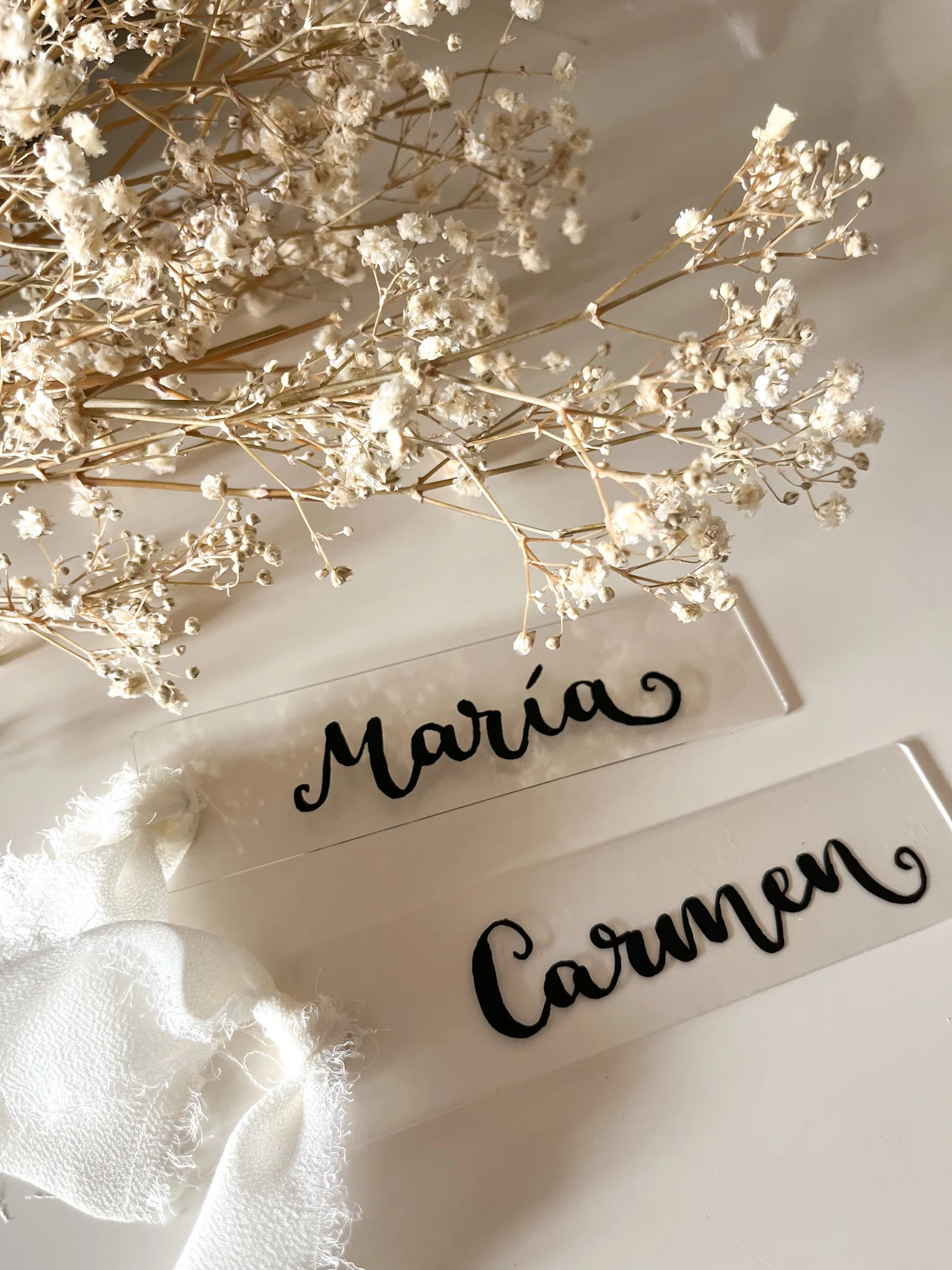 Cada marcasitio está elaborado en material acrílico transparente con nombres caligrafiados a mano en un estilo fluido y elegante, lo que los hace destacar como una opción minimalista pero sofisticada. Son ideales para decoraciones de mesa que requieren un detalle especial y personalizado, al tiempo que proporcionan un recuerdo significativo que tus invitados pueden llevarse.