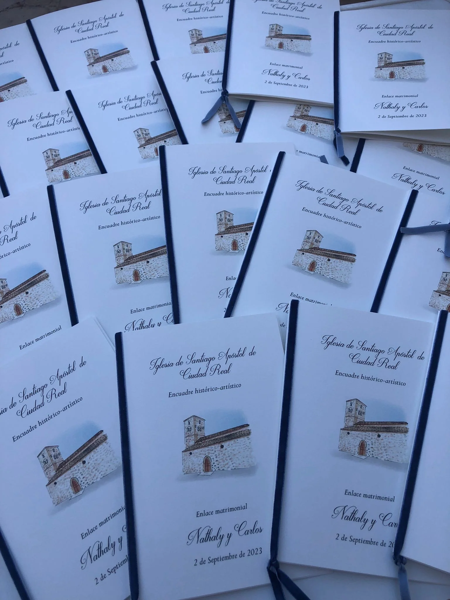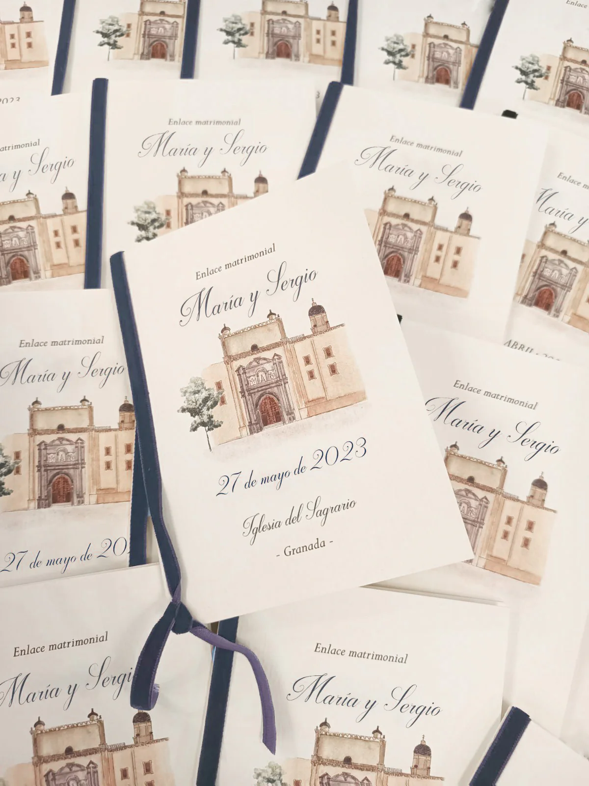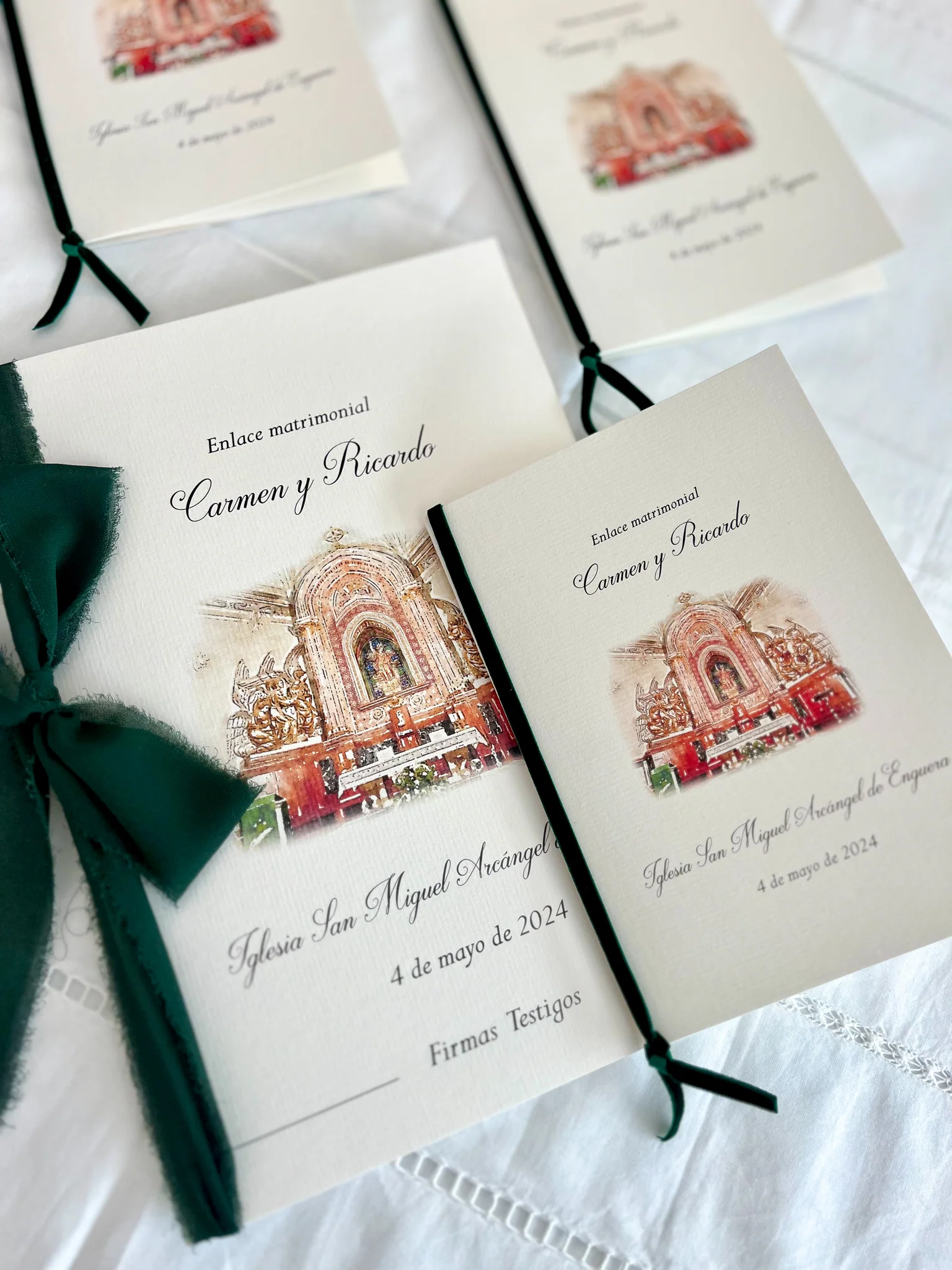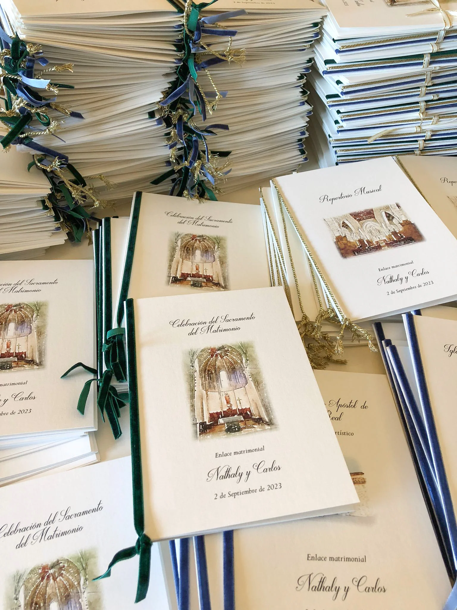 Los misales personalizados son un elemento esencial en la papelería nupcial para guiar a tus invitados durante la ceremonia religiosa. Con ellos, podrán seguir paso a paso el desarrollo del evento, incluidas las lecturas y oraciones.