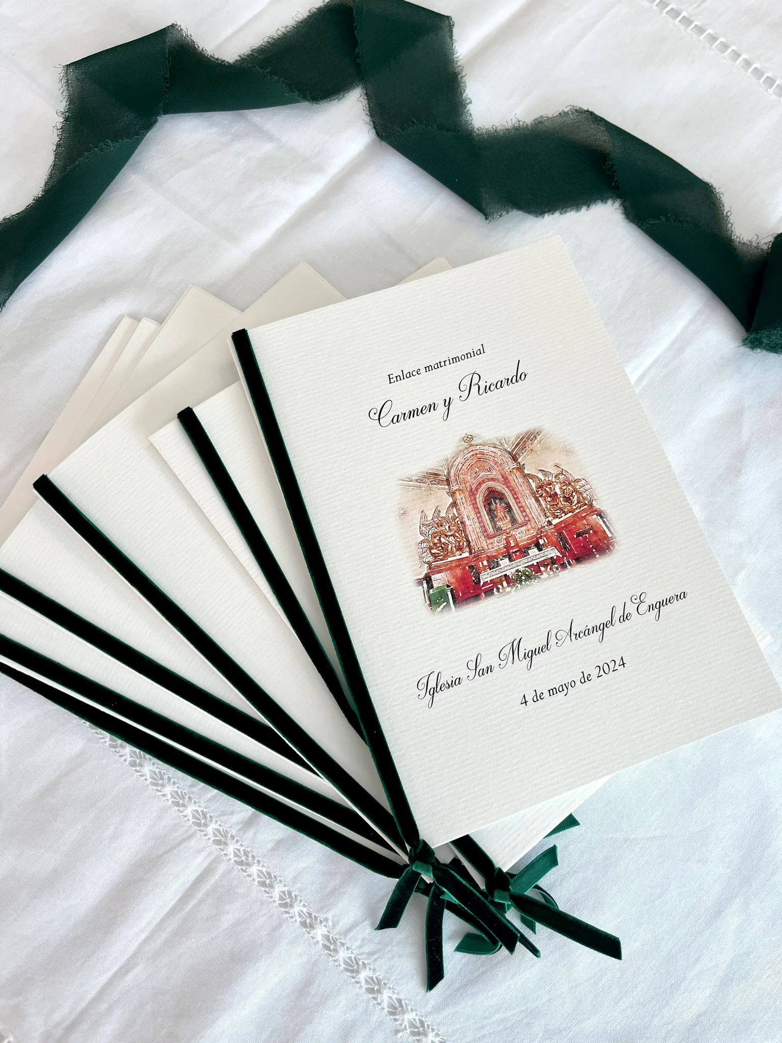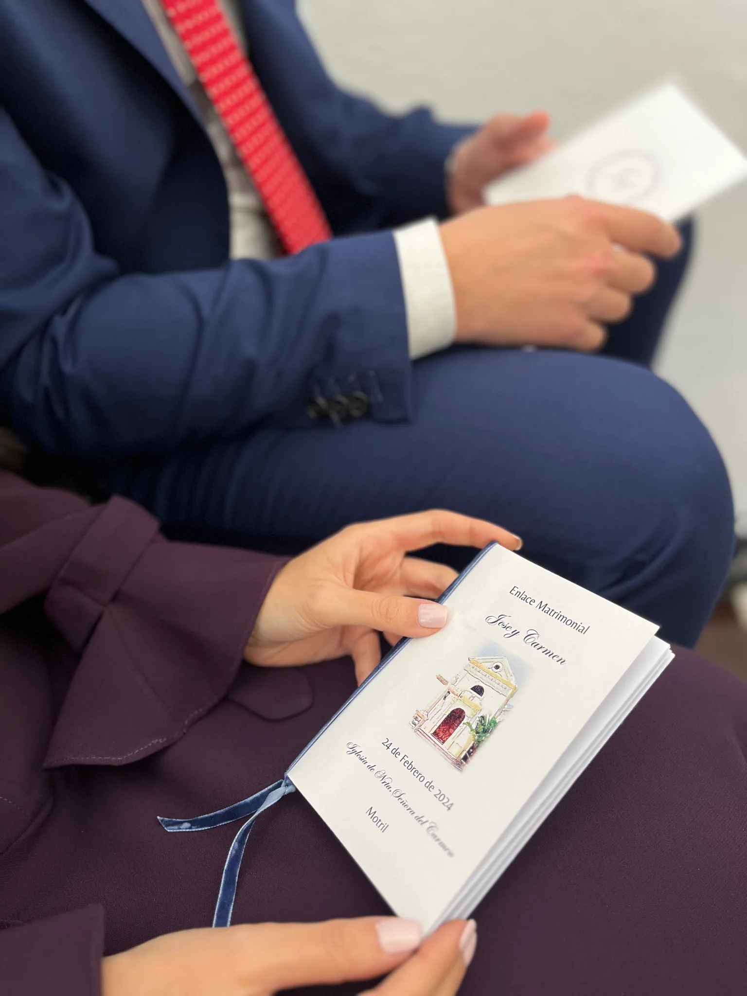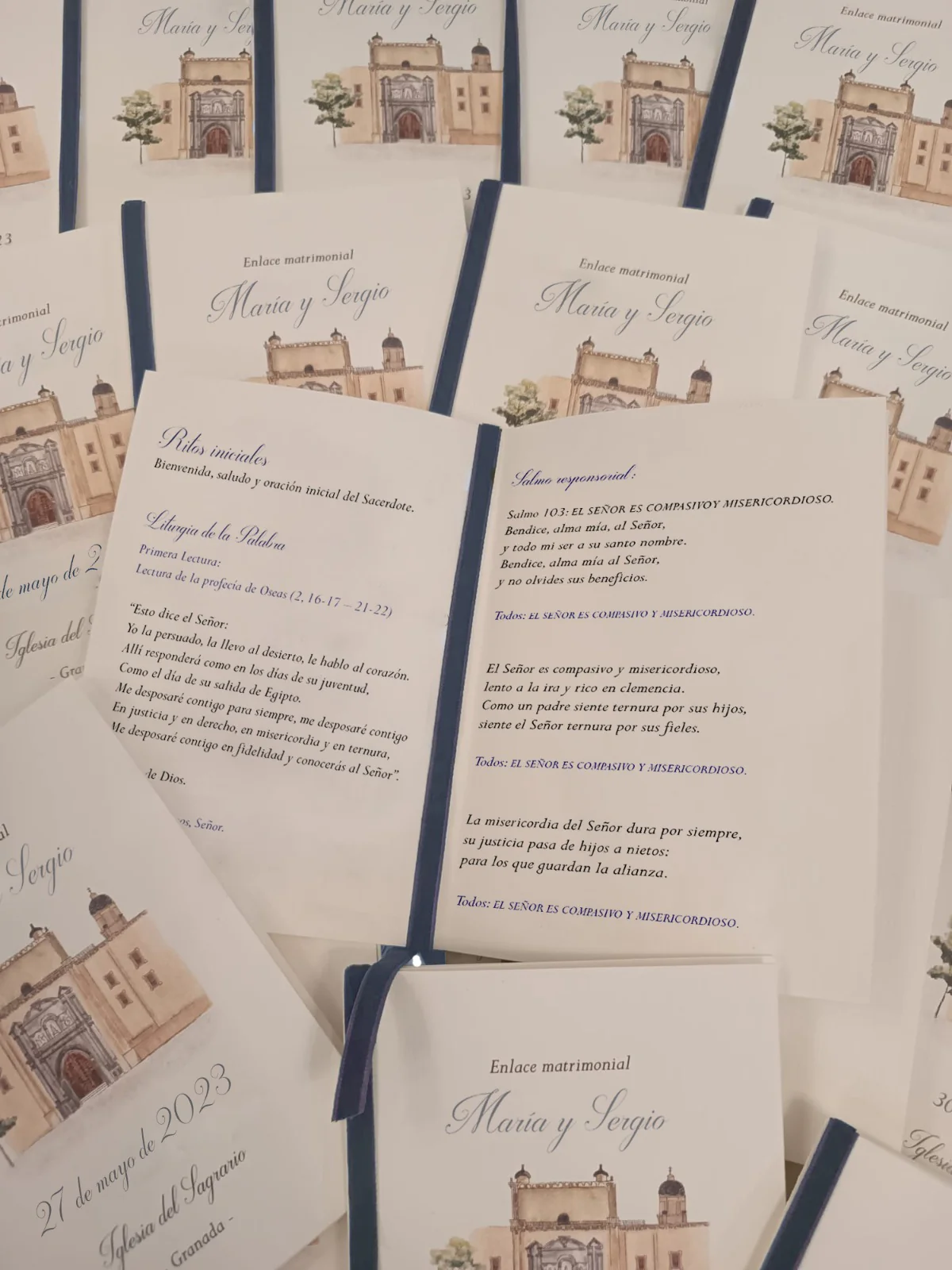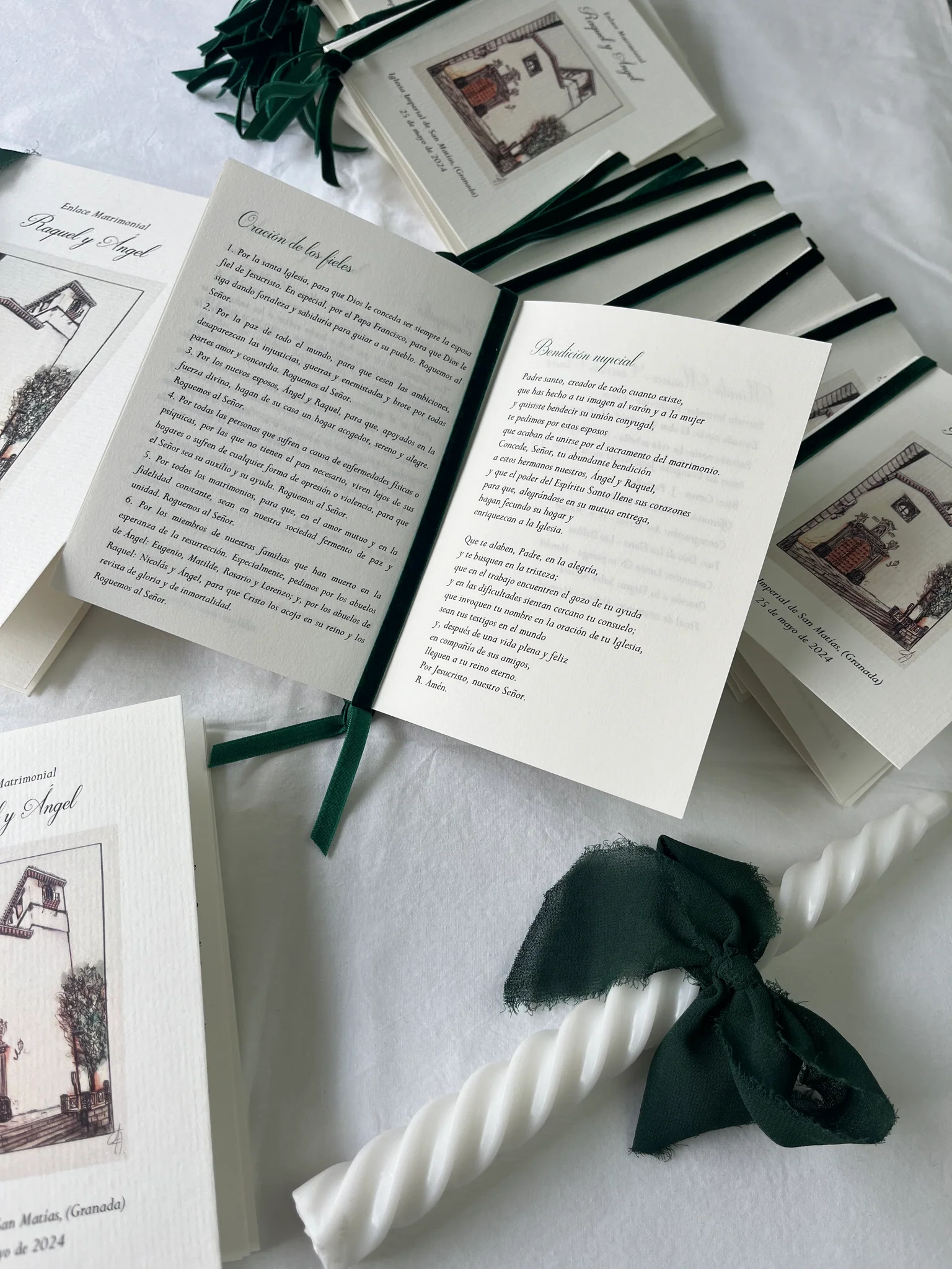 Ofrecemos misales elaborados con papel verjurado marfil de alta calidad, lo que les proporciona un toque elegante y sofisticado. Cada misal incluye el diseño de portada personalizado, la maquetación de las lecturas y el montaje final, decorado con un hermoso lazo de terciopelo, lo que convierte este detalle en un recuerdo significativo para tus invitados.