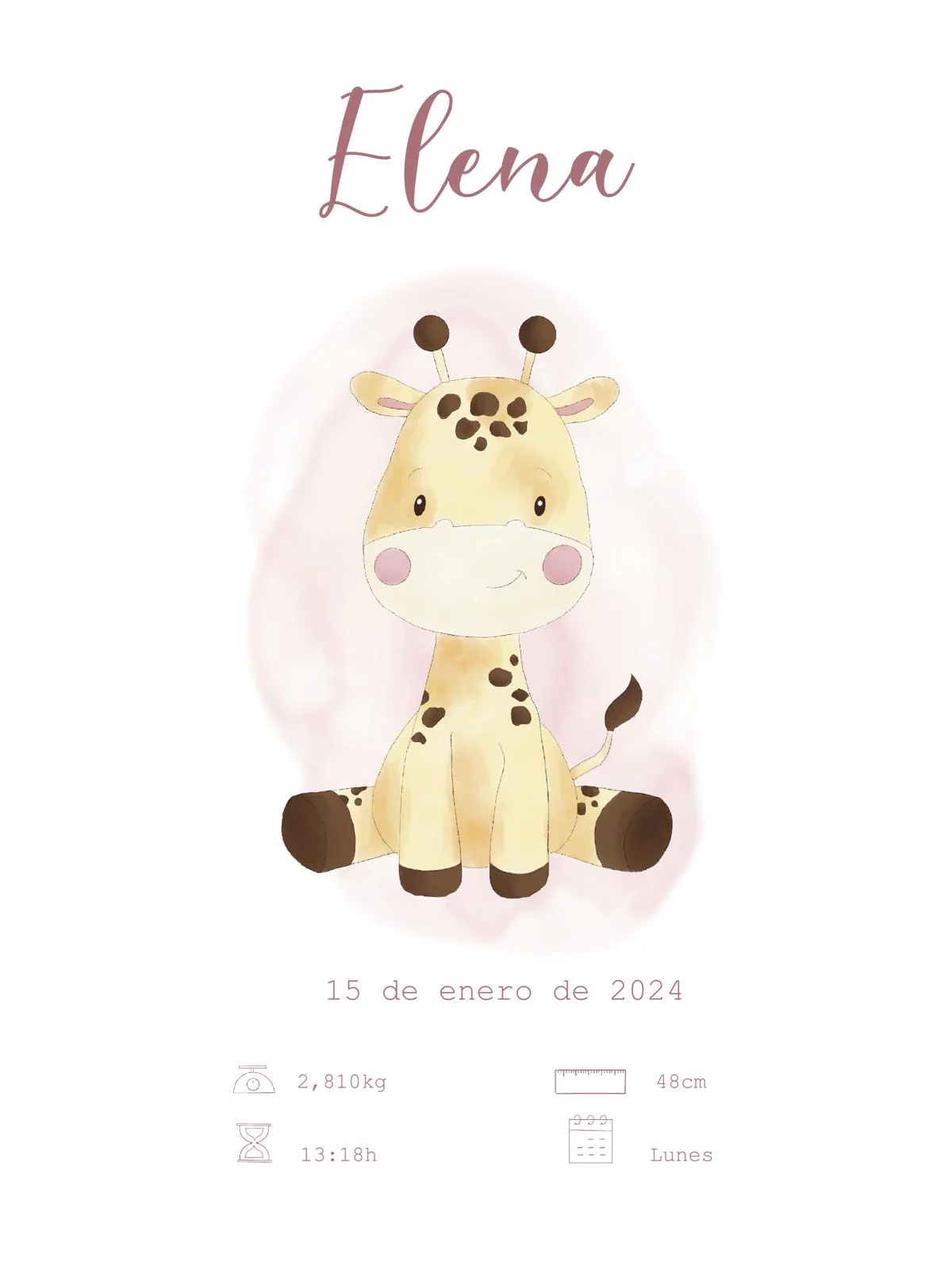 Inmortaliza el nacimiento de tu bebé con nuestras láminas de natalicio personalizadas. En tamaño 20 x 25 cm, cada lámina se ajusta a tus necesidades de diseño, incluyendo el nombre, la fecha y los detalles del nacimiento. Una vez realices el pedido, nos pondremos en contacto contigo en 24/48 horas para que nos indiques los datos necesarios y puedas elegir la ilustración y colores que más te gusten. Las láminas no incluyen marco, lo que te permite personalizar aún más el detalle.