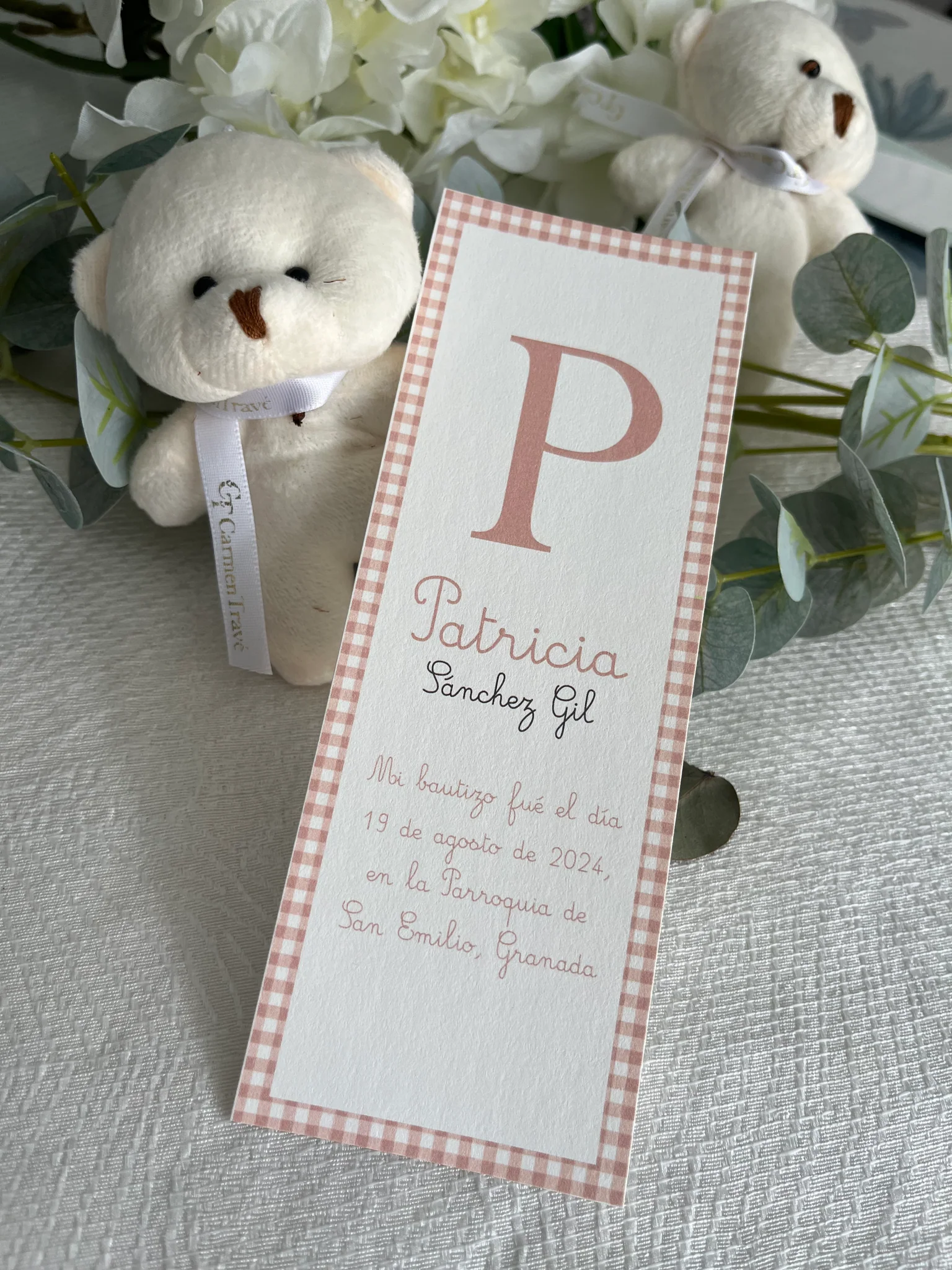 Nuestro punto de libro con inicial estampada es el regalo perfecto para ocasiones especiales como bautizos o comuniones. Personalízalo con la inicial y el diseño que prefieras, haciendo de cada punto de libro un recuerdo único para tus invitados. Con un acabado delicado y sofisticado, será un detalle práctico y bonito que todos querrán conservar.