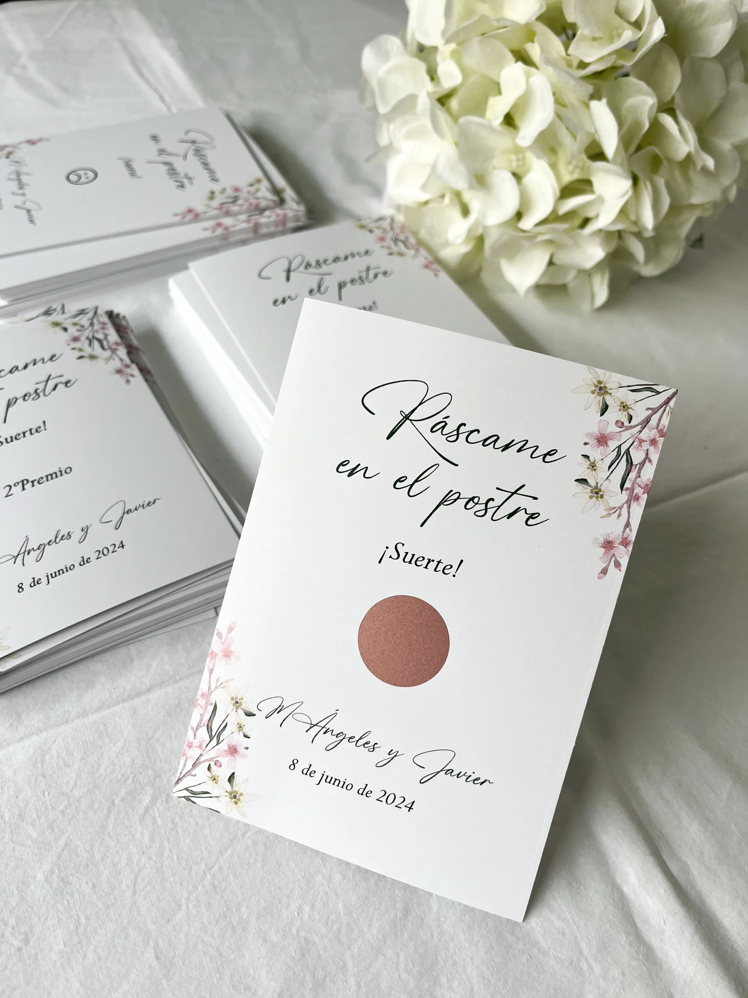 Además, diseñamos los rascas a juego con tu invitación, garantizando que cada detalle de tu boda sea coherente y elegante. ¡Imagina la sonrisa en el rostro de tus seres queridos mientras descubren si han ganado un premio sorpresa!
